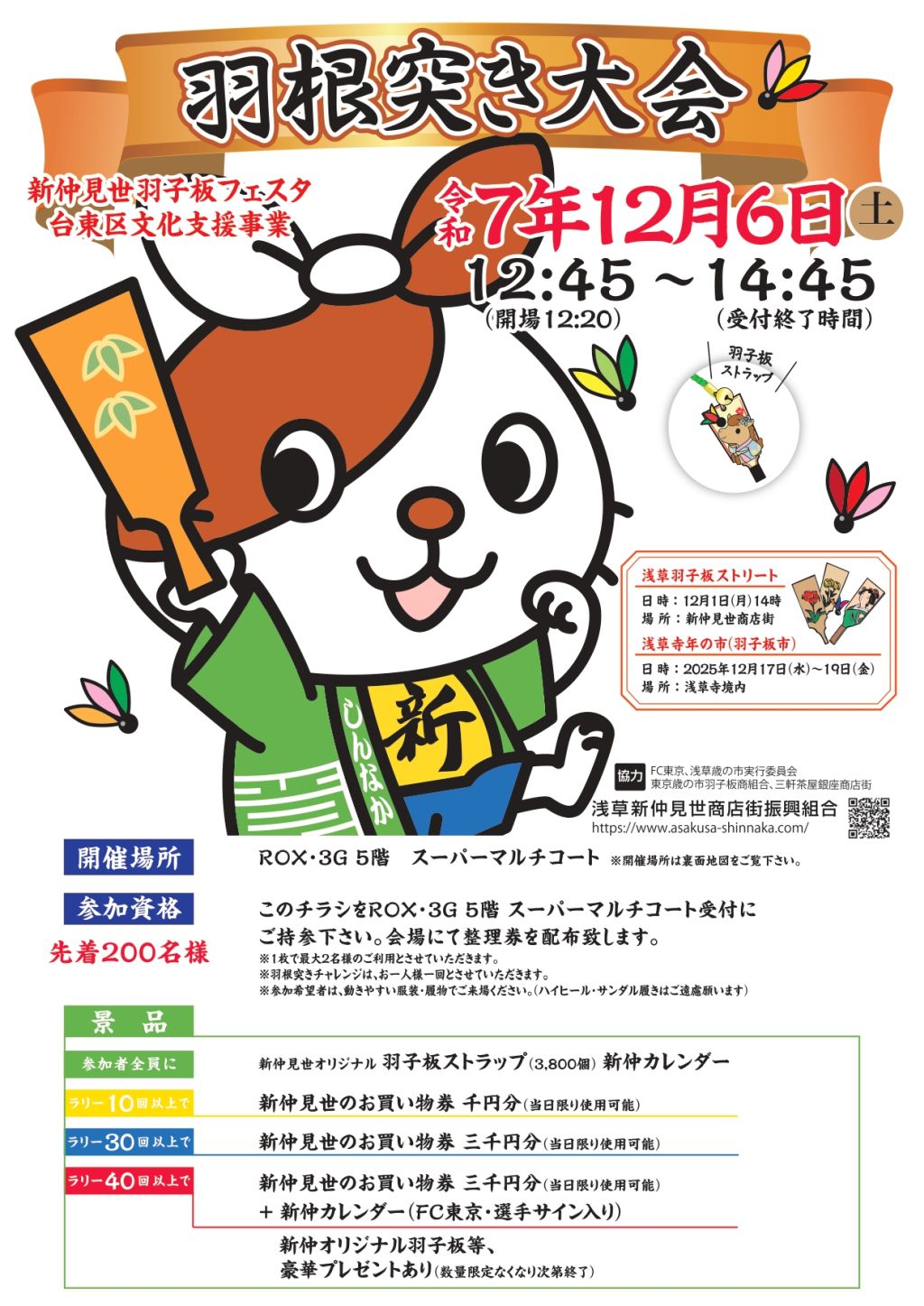 - ラリー40回以上で「新仲見世のお買い物券 三千円分」(当日限り使用可能)+新仲カレンダー(FC東京・選手サイン入り) 新仲オリジナル羽子板等、豪華プレゼントあり(数量限定なくなり次第終了)